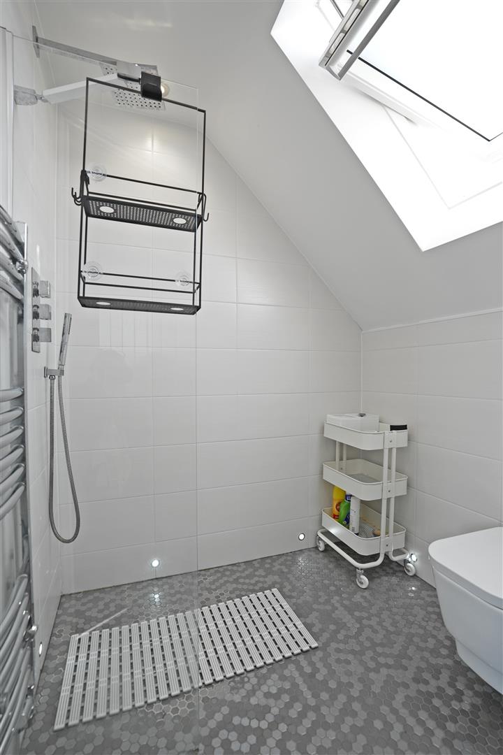 En-Suite - Wash hand basin. Low flush W.C. Walk-in shower. Chrome towel radiator. Velux window.