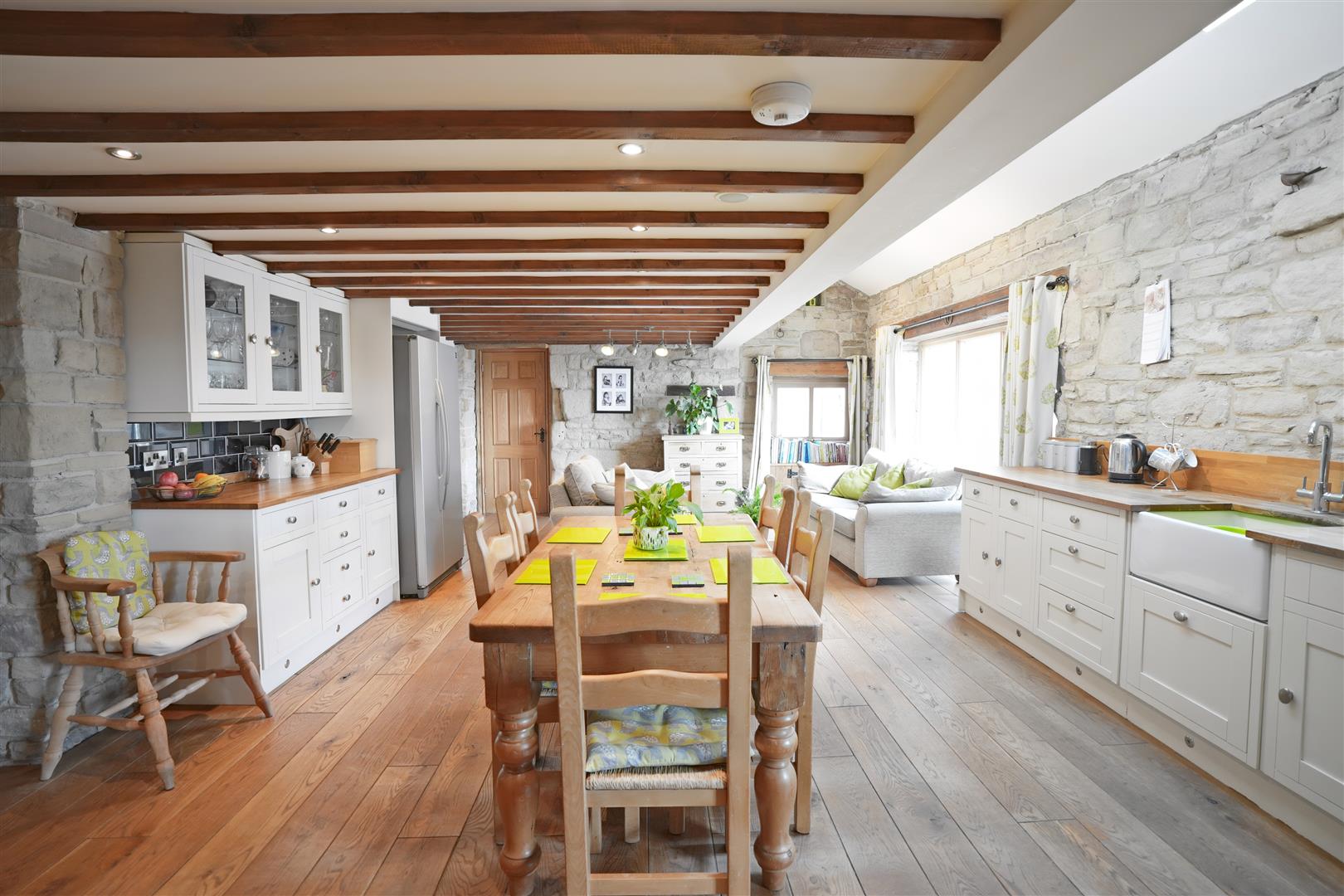 Dining Kitchen - 8.43 x 4.86 (27'7" x 15'11") - Base units. Wood worksurfaces. Ceramic sink. Rangemaster gas range. Integrated dishwasher. Exposed stone walls. Ceiling beams. Radiator. Stable door to front elevation. Wooden windows to front and side elevations.