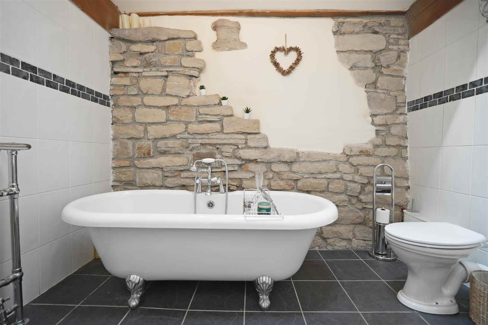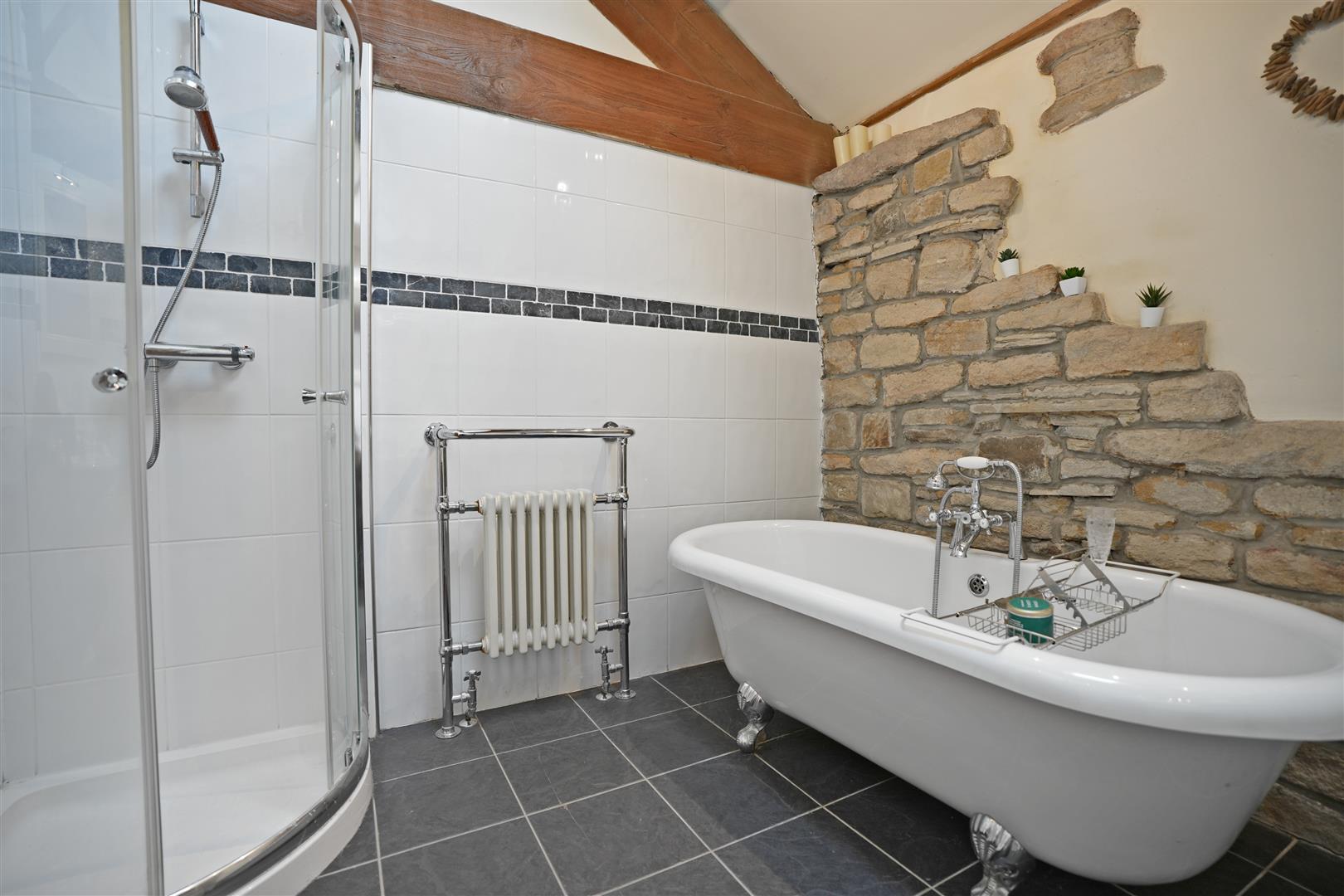 Bathroom - Wash hand basin. Low flush W.C. Roll top bath. Shower cubicle. Exposed stone walls. Exposed beams. Traditional style towel radiator. Velux window.