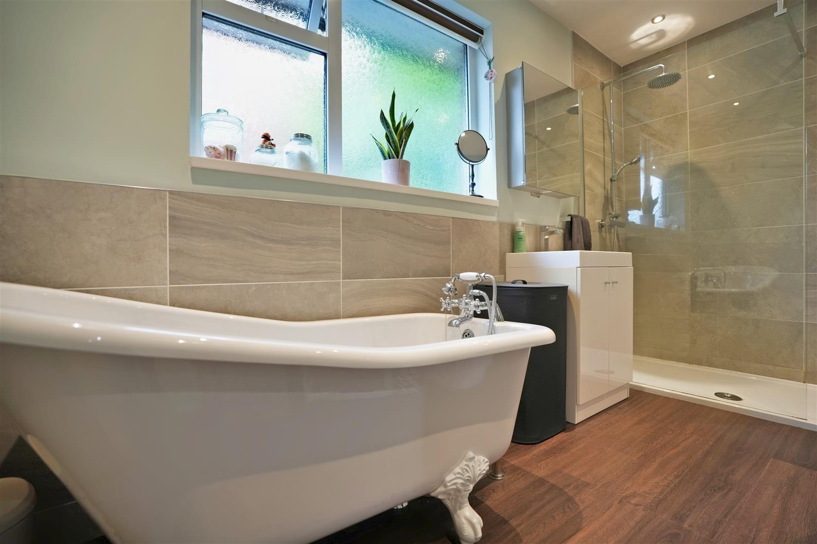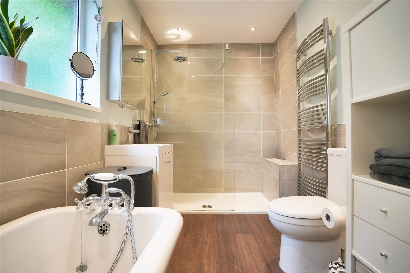 Bathroom - Wash hand basin. Low flush W.C. Roll top bath. Double shower. Partially tiled. Chrome towel radiator. UPVC double glazed window to side elevation.