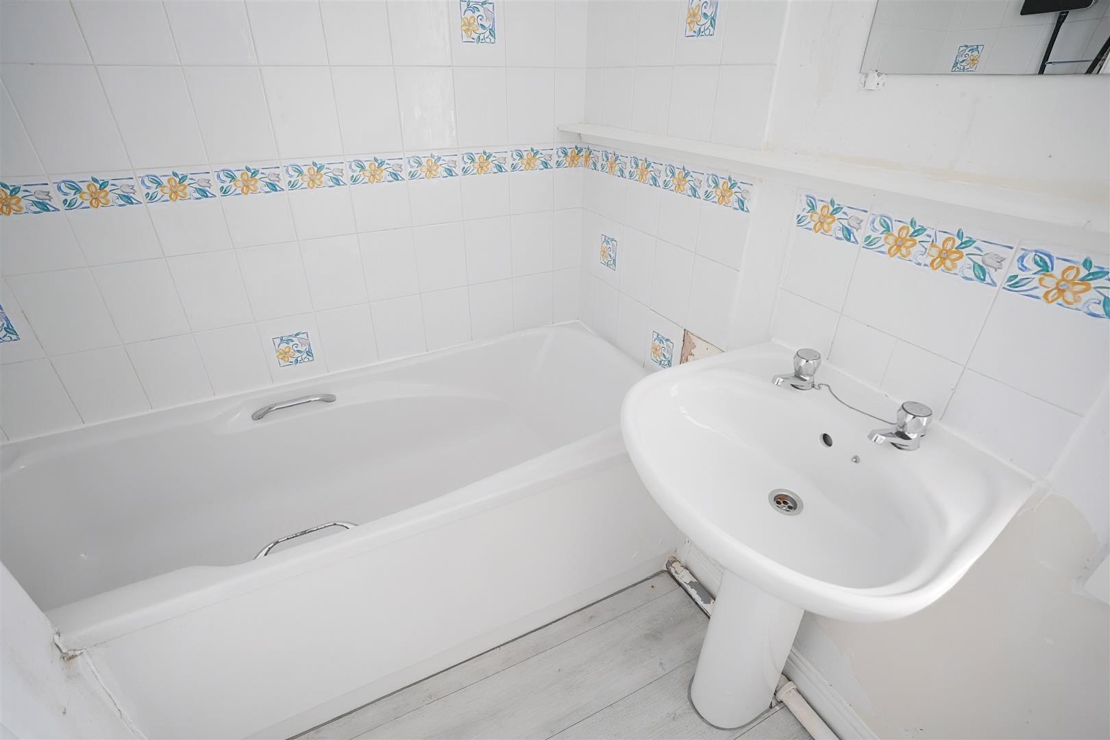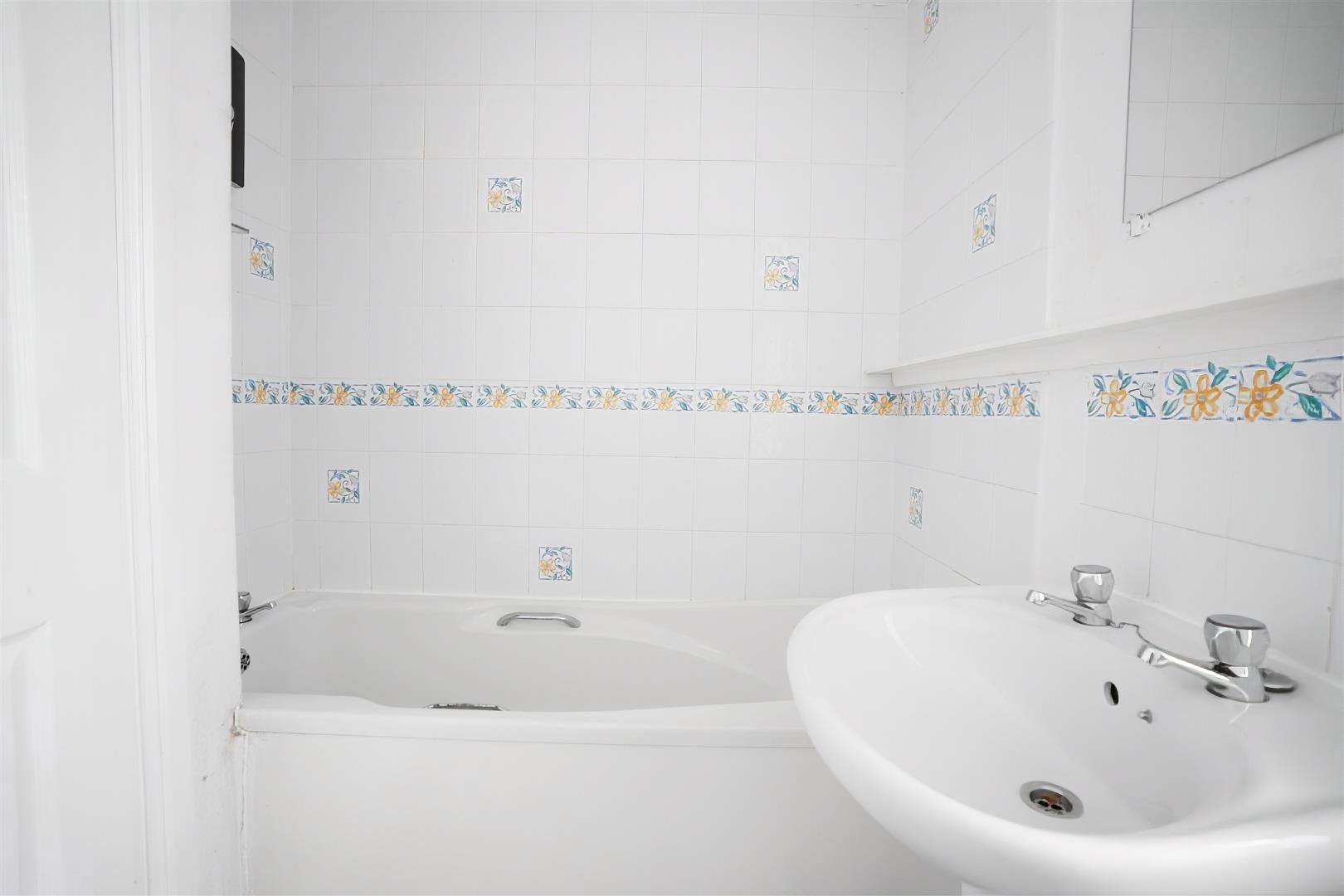 Bathroom - White three piece suite comprising bath with shower over, wash hand basin and WC. Partially tiled.