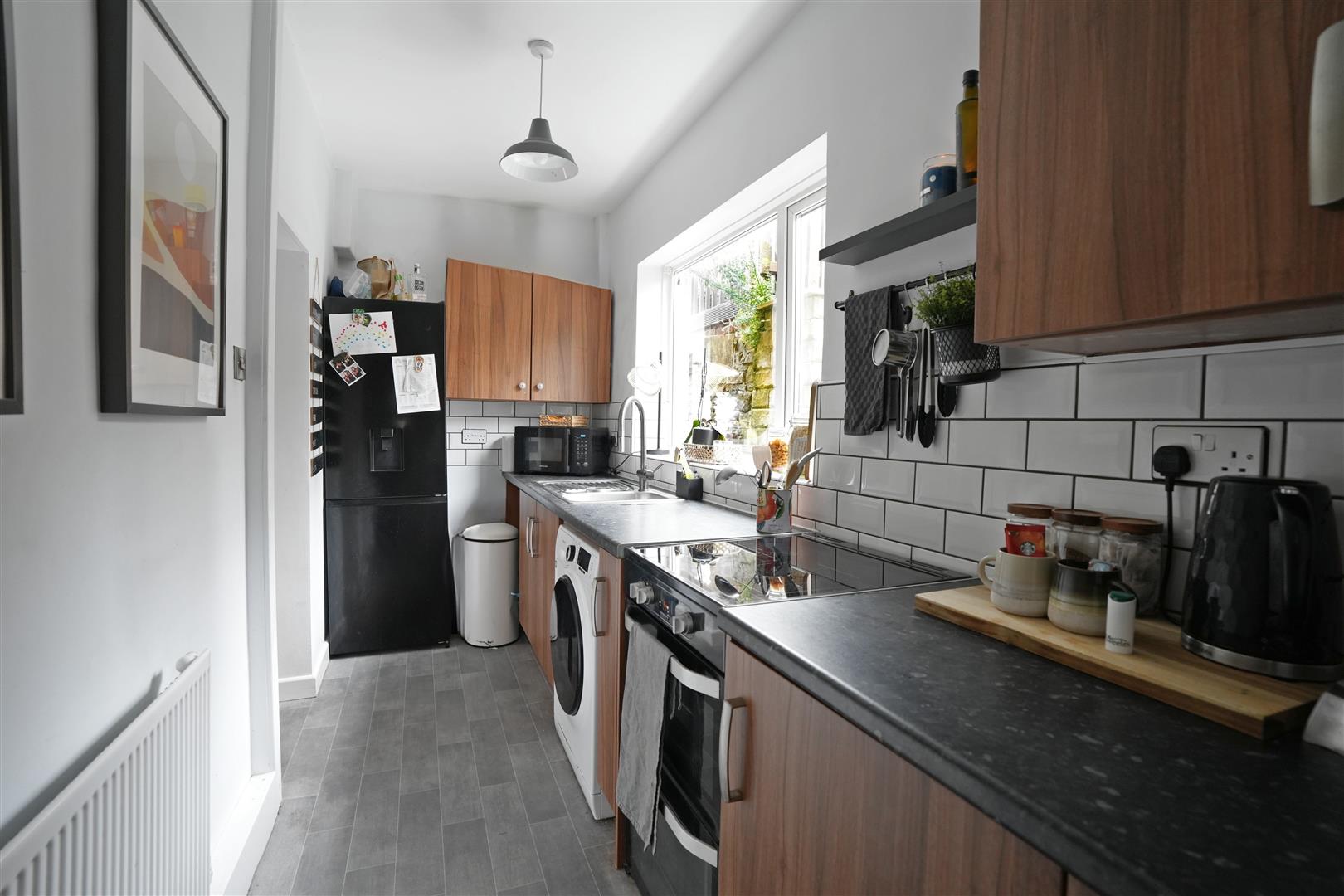 Kitchen - 4.408 x 1.611 (14'5" x 5'3") - Fitted kitchen with a range of wall and base units. Stainless steel one and half bowl sink. Tiled splashback. Plumbing for washing machine. Space for tumble dryer. Gas cooker included. Radiator. UPVC double glazed window to rear elevation. Wooden door to rear garden.