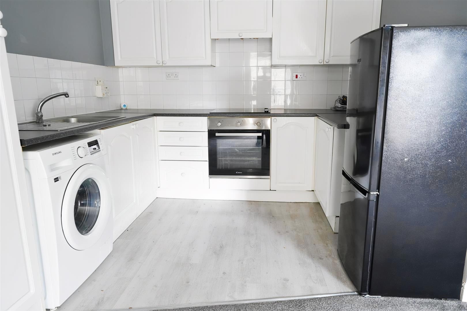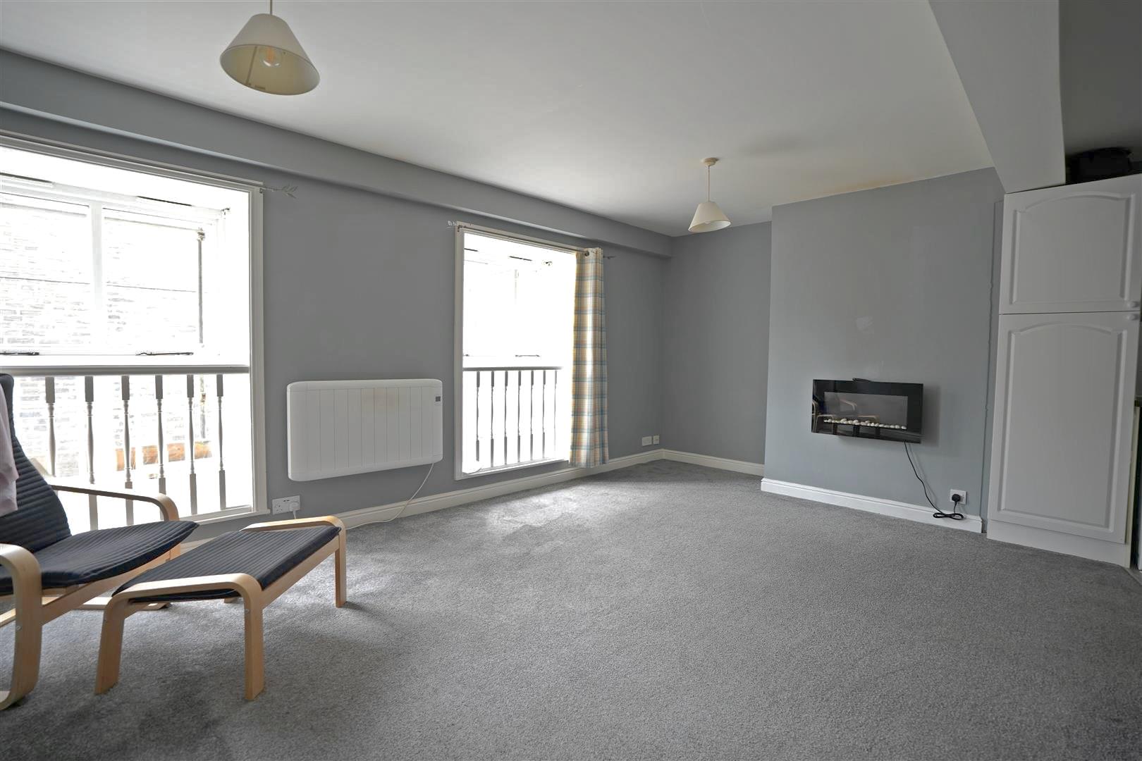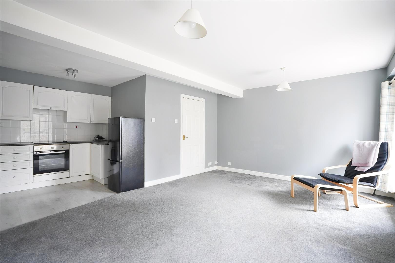 Accessed via a communal entrance, the accommodation comprises a private hallway leading to a spacious open-plan living area and fitted kitchen, creating a bright and sociable layout. A generous double bedroom provides comfortable sleeping space, while the house bathroom completes the internal accommodation.