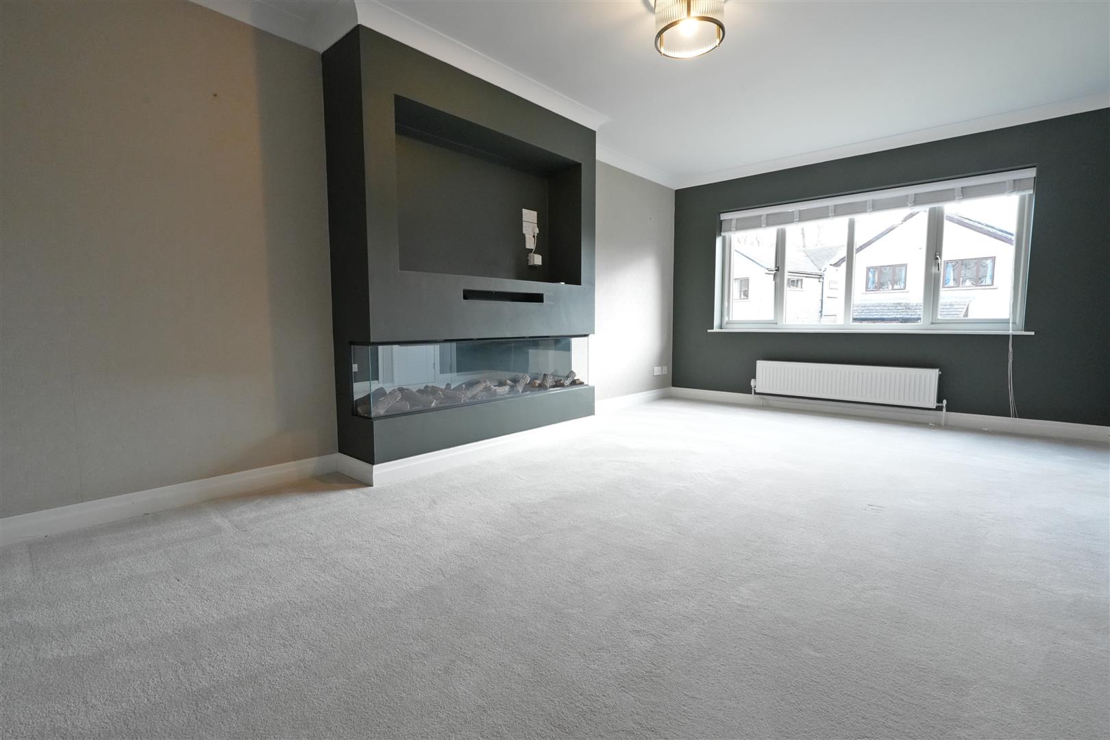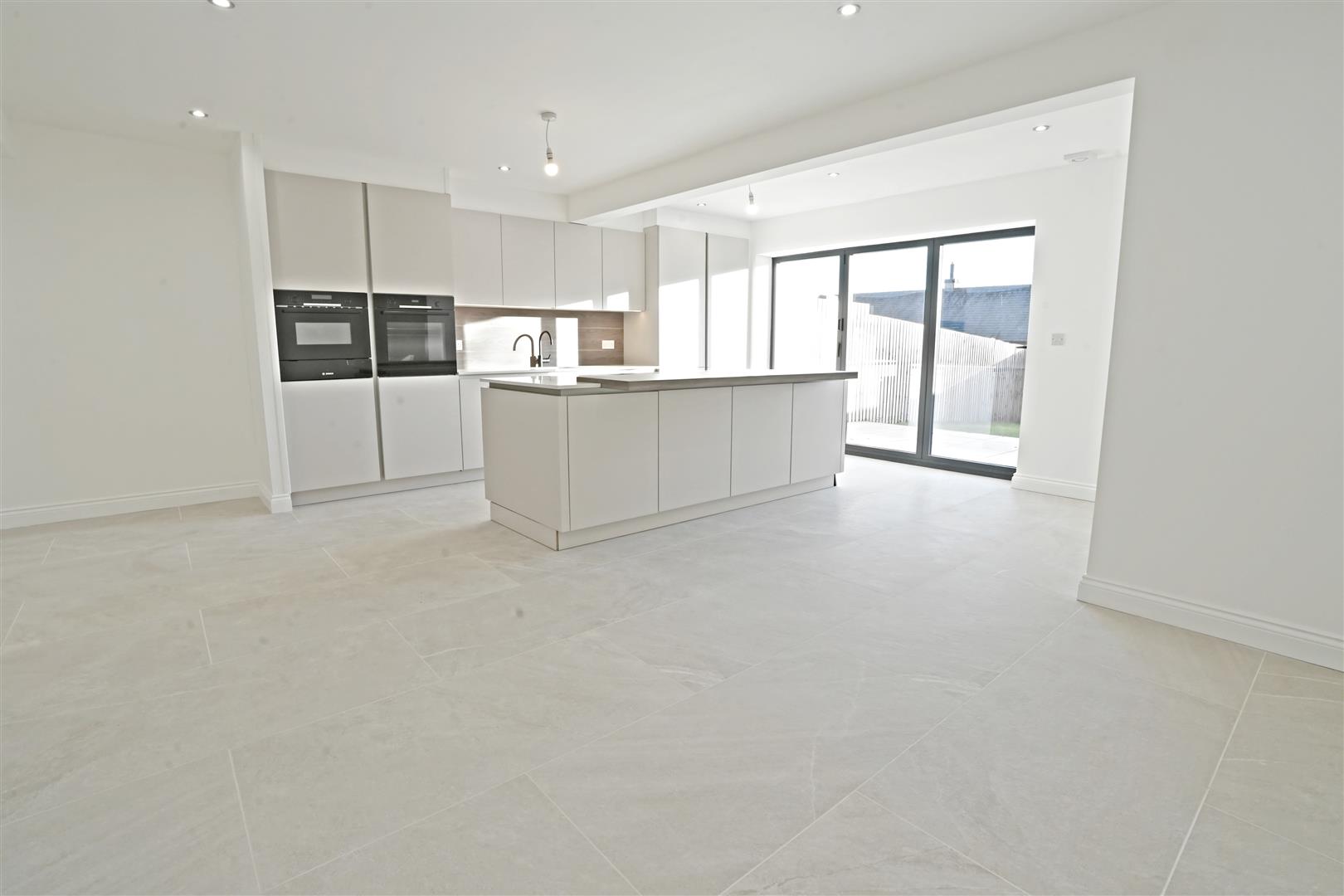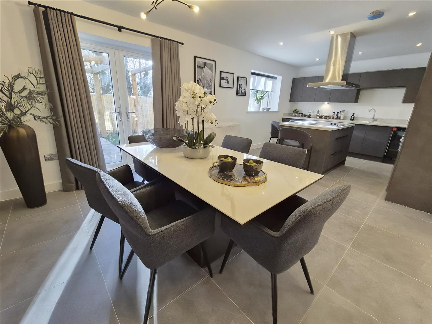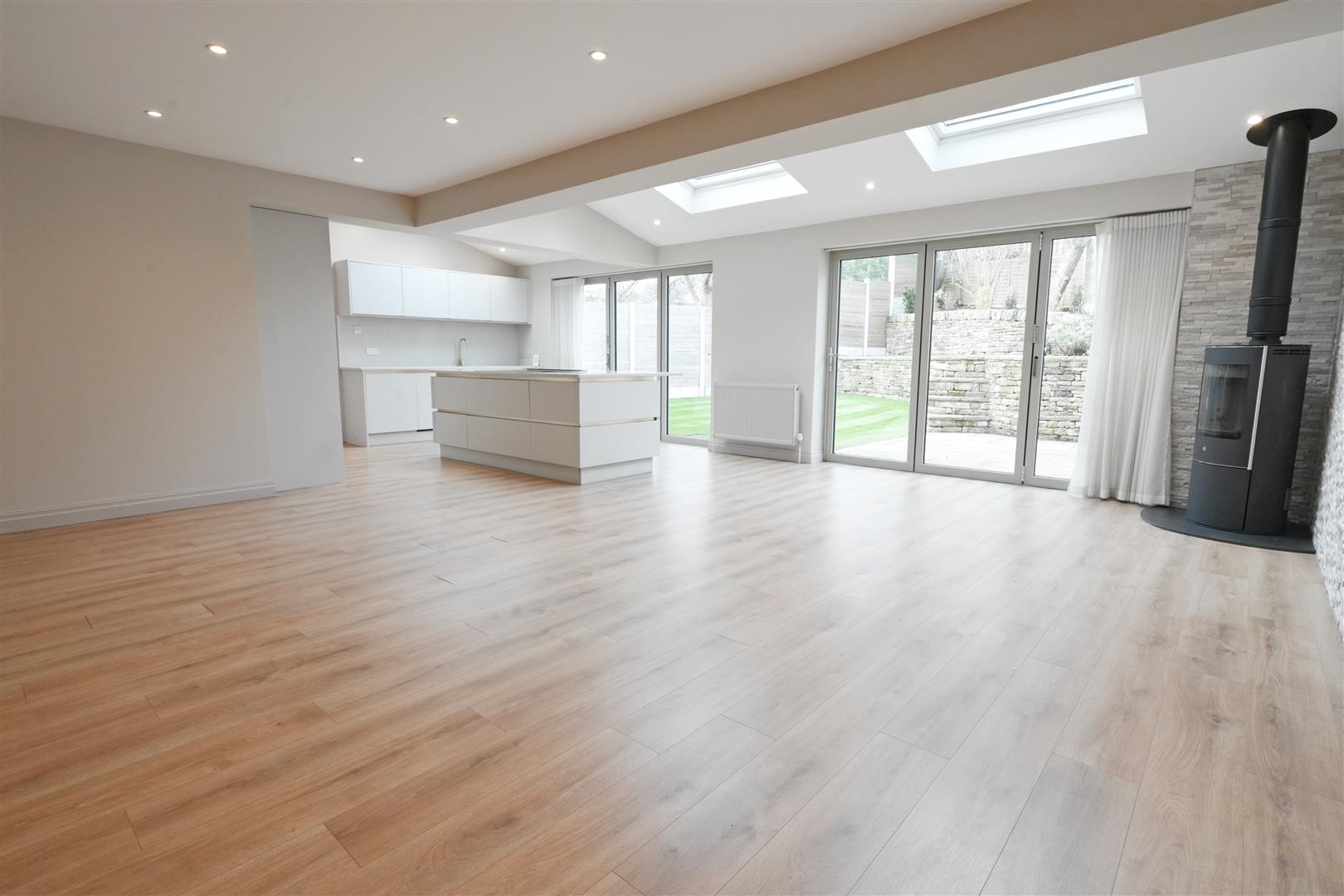 At the heart of the home is a stunning bespoke dining kitchen, complete with a central island and high-end fittings -perfect for both everyday dining and entertaining. The property boasts two generous reception rooms, including a stylish lounge featuring a media wall with a contemporary electric fire.